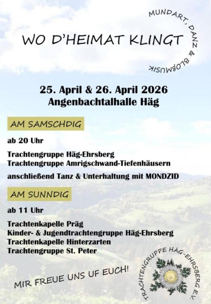 Am Sa. 25. April trete mir in de  Angebachtalhalle in Häg uf. Mir spiile e volles Programm. Mir freue uns druf!